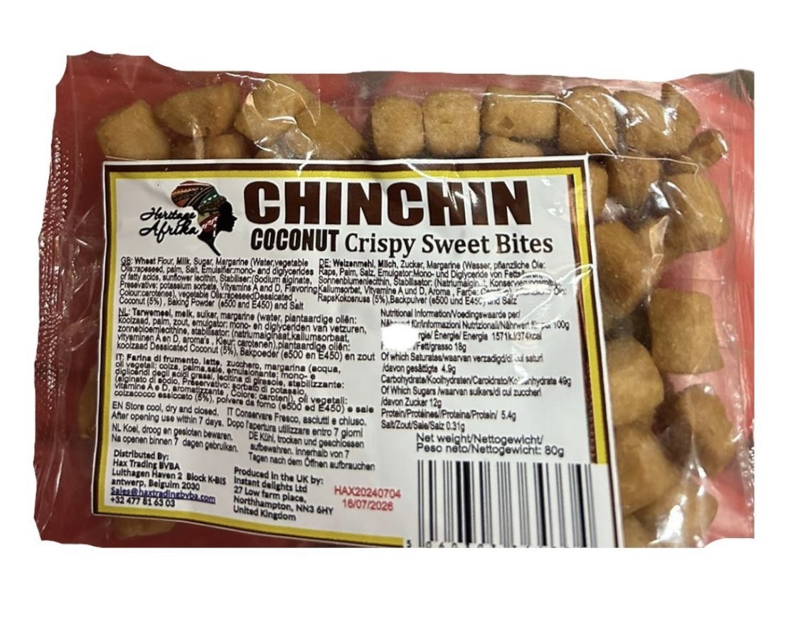 Chinchin Coconut Crispy Sweet Bites 80g: African Sun Chin Chin is a traditional African snack made from wheat flour. Its usually a savoury snack however there are sweet version.